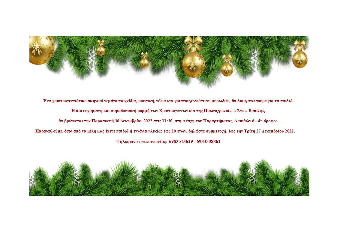 Ο Άγιος Βασίλης θα βρίσκεται την Παρασκευή 30 Δεκεμβρίου στη Λέσχη του Παραρτήματος Λαπιθών 6, 4ος όροφος, όπου θα μοιράσει δώρα στους μικρούς μας φίλους.